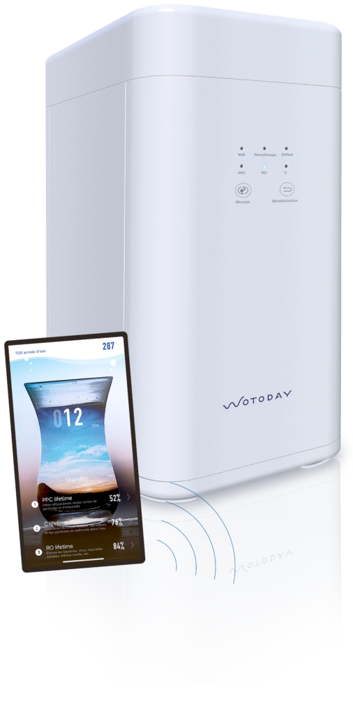 Composée de plusieurs filtres, d’une membrane à osmose inverse et d’un stérilisateur à diode UV, la BOX WOTODAY filtre à la fois les particules organiques, la pollution chimique et celle due aux médicaments. Elles éliminent de votre eau de boisson la rouille, le calcaire, le chlore, les pesticides et autres dérivés du pétrole, les résidus médicamenteux, les hormones, les perturbateurs endocriniens, les bactéries, les métaux lourds, les virus.